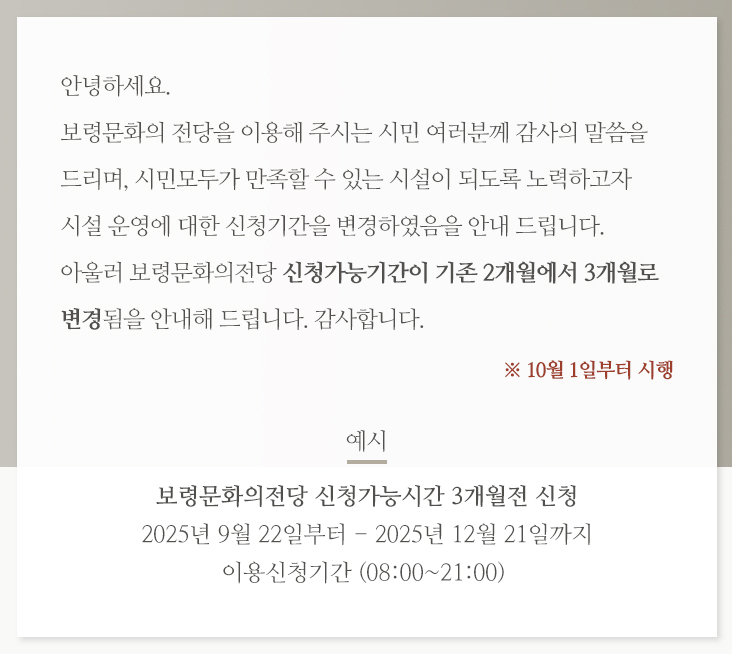 **10월 연휴 개관 안내**10월 공휴일 및 추석 연휴기간 중 보령문화의전당(보령박물관, 갯벌생태과학관, 보령문학관, 장암서예관)을 아래와 같이 운영하오니 참고하시기를 바랍니다. <!--[if !supportEmptyParas]--> 10. 3.(금)개천절10. 4.(토)~10. 5.(일)10. 6.(월)추석10. 7.(화)~10.8(수)10. 9.(목)한글날개관개관휴관개관개관 <!--[if !supportEmptyParas]--> <!--[endif]--> <o:p /><!--[data-hwpjson]{ "documentPr": { "di": "", "dp": { "dn": "test.hwp", "ta": 1, "d1": 5, "d2": 1, "dv": 0, "dr": 1, "do": 1, "vj": "1.1", "an": "Hancom Office Hangul", "av": "10, 0, 0, 14515", "ao": "WIN", "ab": "32", "ar": "LE", "as": "Windows_8" }, "dis": false, "ds": { "ti": "", "la": "ko", "cr": "", "su": "", "de": "", "cd": "2025-10-01T15:37:44.343Z", "md": "1601-01-01T09:00:00.000Z", "pd": "1601-01-01T09:00:00.000Z", "ke": "" } }, "dh": { "do": { "pa": 1, "fo": 1, "en": 1, "pi": 1, "tb": 1, "eq": 1 }, "fo": [ ], "cd": { "tp": 0, "lc": { "af": false, "ui": false, "fu": false, "dn": false, "ul": false, "el": false, "at": false, "tq": false, "da": false, "dw": false, "dj": false, "bc": false, "bu": false, "al": false, "ab": false, "ap": false, "an": false, "aa": false, "ds": false, "de": false, "as": false, "cp": false, "ao": false, "et": false, "ay": false, "am": false, "a1": false, "bt": false, "av": false, "dh": false, "dp": false, "d1": false, "mf": false, "bl": false, "ag": false, "dg": false, "ae": false, "df": false, "do": false, "dl": false, "di": false, "d2": false, "d3": false, "ob": false, "d4": false, "ev": false, "d5": false, "d6": false, "a2": false, "dc": false } }, "ld": { "pa": "", "pi": true, "fo": false } }, "bf": { "01DC329DE55C2DB000000024": { "id": 1, "td": false, "sh": false, "st": 0, "sc": 0, "si": false, "bt": 0, "bi": false, "cl": 0, "bc": false, "lt": 0, "lw": 0, "lc": 0, "rt": 0, "rw": 0, "rc": 0, "tt": 0, "tw": 0, "tc": 0, "bbt": 0, "bbw": 0, "bbc": 0, "dt": 1, "dw": 0, "dc": 0, "fi": { } }, "01DC329DE55C2DB000000025": { "id": 2, "td": false, "sh": false, "st": 0, "sc": 0, "si": false, "bt": 0, "bi": false, "cl": 0, "bc": false, "lt": 0, "lw": 0, "lc": 0, "rt": 0, "rw": 0, "rc": 0, "tt": 0, "tw": 0, "tc": 0, "bbt": 0, "bbw": 0, "bbc": 0, "dt": 1, "dw": 0, "dc": 0, "fi": { "wb": { "fc": 4294967295, "hc": 0, "al": 0, "hs": -1 } } }, "01DC329DE55C2DB000000026": { "id": 3, "td": false, "sh": false, "st": 0, "sc": 0, "si": false, "bt": 0, "bi": false, "cl": 0, "bc": false, "lt": 0, "lw": 0, "lc": 0, "rt": 0, "rw": 0, "rc": 0, "tt": 0, "tw": 0, "tc": 0, "bbt": 0, "bbw": 0, "bbc": 0, "dt": 1, "dw": 0, "dc": 0, "fi": { "wb": { "fc": 4294967295, "hc": 10066329, "al": 0, "hs": -1 } } }, "01DC329DE55C2DB000000027": { "id": 4, "td": false, "sh": false, "st": 0, "sc": 0, "si": false, "bt": 0, "bi": false, "cl": 0, "bc": false, "lt": 0, "lw": 1, "lc": 0, "rt": 0, "rw": 1, "rc": 0, "tt": 0, "tw": 1, "tc": 0, "bbt": 0, "bbw": 1, "bbc": 0, "dt": 0, "dw": 1, "dc": 0, "fi": { } }, "01DC329DE55C2DB000000028": { "id": 5, "td": false, "sh": false, "st": 0, "sc": 0, "si": false, "bt": 0, "bi": false, "cl": 0, "bc": false, "lt": 1, "lw": 8, "lc": 0, "rt": 1, "rw": 8, "rc": 0, "tt": 1, "tw": 8, "tc": 0, "bbt": 1, "bbw": 8, "bbc": 0, "dt": 0, "dw": 1, "dc": 0, "fi": { } } }, "cp": { "01DC329DE55C2DB000000029": { "id": 0, "he": 1000, "tc": 0, "sc": 4294967295, "uf": false, "uk": false, "sm": 0, "bf": "01DC329DE55C2DB000000024", "f1": "한컴바탕", "t1": 1, "f2": "한컴바탕", "t2": 1, "f3": "함초롬바탕", "t3": 1, "f4": "한컴바탕", "t4": 1, "f5": "한컴바탕", "t5": 1, "f6": "한컴바탕", "t6": 1, "f7": "한컴바탕", "t7": 1, "r1": 100, "r2": 100, "r3": 100, "r4": 100, "r5": 100, "r6": 100, "r7": 100, "s1": 0, "s2": 0, "s3": 0, "s4": 0, "s5": 0, "s6": 0, "s7": 0, "e1": 100, "e2": 100, "e3": 100, "e4": 100, "e5": 100, "e6": 100, "e7": 100, "o1": 0, "o2": 0, "o3": 0, "o4": 0, "o5": 0, "o6": 0, "o7": 0, "it": false, "bo": false, "ut": 0, "us": 1, "uc": 0, "st": false, "ss": 1, "so": 0, "ot": 0, "ht": 0, "hc": 0, "hx": 0, "hy": 0, "em": false, "en": false, "su": false, "sb": false }, "01DC329DE55C2DB00000002A": { "id": 1, "he": 1200, "tc": 0, "sc": 4294967295, "uf": false, "uk": false, "sm": 0, "bf": "01DC329DE55C2DB000000025", "f1": "함초롬바탕", "t1": 1, "f2": "함초롬바탕", "t2": 1, "f3": "함초롬바탕", "t3": 1, "f4": "함초롬바탕", "t4": 1, "f5": "함초롬바탕", "t5": 1, "f6": "함초롬바탕", "t6": 1, "f7": "함초롬바탕", "t7": 1, "r1": 100, "r2": 100, "r3": 100, "r4": 100, "r5": 100, "r6": 100, "r7": 100, "s1": 0, "s2": 0, "s3": 0, "s4": 0, "s5": 0, "s6": 0, "s7": 0, "e1": 100, "e2": 100, "e3": 100, "e4": 100, "e5": 100, "e6": 100, "e7": 100, "o1": 0, "o2": 0, "o3": 0, "o4": 0, "o5": 0, "o6": 0, "o7": 0, "it": false, "bo": false, "ut": 0, "us": 1, "uc": 0, "st": false, "ss": 1, "so": 0, "ot": 0, "ht": 0, "hc": 0, "hx": 0, "hy": 0, "em": false, "en": false, "su": false, "sb": false }, "01DC329DE55C2DB00000002B": { "id": 2, "he": 1200, "tc": 0, "sc": 4294967295, "uf": false, "uk": false, "sm": 0, "bf": "01DC329DE55C2DB000000024", "f1": "함초롬바탕", "t1": 1, "f2": "함초롬바탕", "t2": 1, "f3": "함초롬바탕", "t3": 1, "f4": "함초롬바탕", "t4": 1, "f5": "함초롬바탕", "t5": 1, "f6": "함초롬바탕", "t6": 1, "f7": "함초롬바탕", "t7": 1, "r1": 100, "r2": 100, "r3": 100, "r4": 100, "r5": 100, "r6": 100, "r7": 100, "s1": 0, "s2": 0, "s3": 0, "s4": 0, "s5": 0, "s6": 0, "s7": 0, "e1": 100, "e2": 100, "e3": 100, "e4": 100, "e5": 100, "e6": 100, "e7": 100, "o1": 0, "o2": 0, "o3": 0, "o4": 0, "o5": 0, "o6": 0, "o7": 0, "it": false, "bo": false, "ut": 0, "us": 1, "uc": 0, "st": false, "ss": 1, "so": 0, "ot": 0, "ht": 0, "hc": 0, "hx": 0, "hy": 0, "em": false, "en": false, "su": false, "sb": false }, "01DC329DE55C2DB00000002C": { "id": 3, "he": 1000, "tc": 0, "sc": 4294967295, "uf": false, "uk": false, "sm": 0, "bf": "01DC329DE55C2DB000000026", "f1": "함초롬바탕", "t1": 